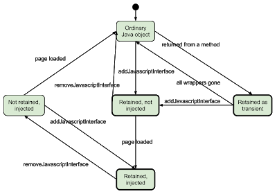 - 새로운 Java objects (from Java -> JS), addJavascriptInterface가 콜되는 것처럼 JavaScript에 "주입"되지만 이름을 제공하지 않는다. 또한 이러한 일시적인 object 의 수명 주기는 inject된 object와 다르다. (아래 참조)