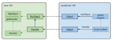 Java VM과 JavaScript VM은 독립적이며 서로의 존재를 모르는 상태다. 서로 다른 프로세스에서 작동할 수 있고, 이론상으로는 서로 다른 물리적 기계에서도 작동할 수 있다. 그래서 지금 위 그림상으로는 서로 객체를 참조하고 있는것처럼 보이지만 진짜 참조가 아니고 실제로는 "Java Bridge" 에서 필요한 기간동안 Java 객체를 보유하고 있다.