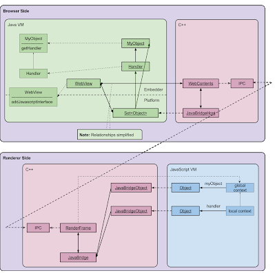 RenderFrame은 단일 HTML 프레임에 해당하며 JavaScript global context object (일명 window)를 "소유"한다. 각각의 JavaScript 인터페이스 object에 대해 해당 JavaBridgeObject 인스턴스가 유지 관리된다. Chromium 용어로 이 object를 “wrapper" 라고 부른다. Gin 기반 구현에서 wrapper는 memory leak를 방지하기 위해 해당 JavaScript 인터페이스 object에 대한 strong references를 보유하지 않는다. wrapper는 해당 JavaScript Object 가 GC 된 후 JavaScript VM에서 알림을 받게된다.