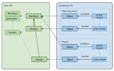 객체에 대한 참조를 전달할 때의 문제는 Java 객체와 JavaScript 인터페이스 간의 대응 관계를 유지하는 것이다. 흥미롭게도 NPAPI 기반 Java Bridge 구현은 메서드에서 Java 개체를 반환할 때 제대로 수행하지 못했다.