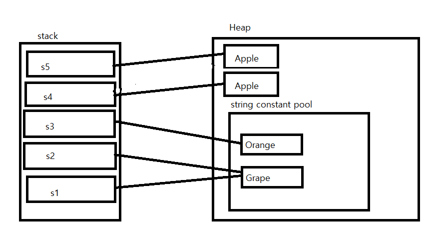String constant pool이란, heap에 존재하는 별도의 공간으로 프로그램에서 사용되는 sonstant string값들이 저장되는 공간이다. 만약 String s1 = "Grape"으로 선언하고 그다음 String s2 = "Grape"로 동일하게 만들면, 이미 존재하는지 확인을 하고 -> 이미 있다면 s2는 s1이 가리키는 곳을 동일하게 가리켜서 재사용 할 수 있게 한다. String s3="Orange" 에서는 없기때문에 새로 할당한다. 이 과정을 intern()이라고 하고, 대략적으로 그림으로 나타내면 다음과 같다.
